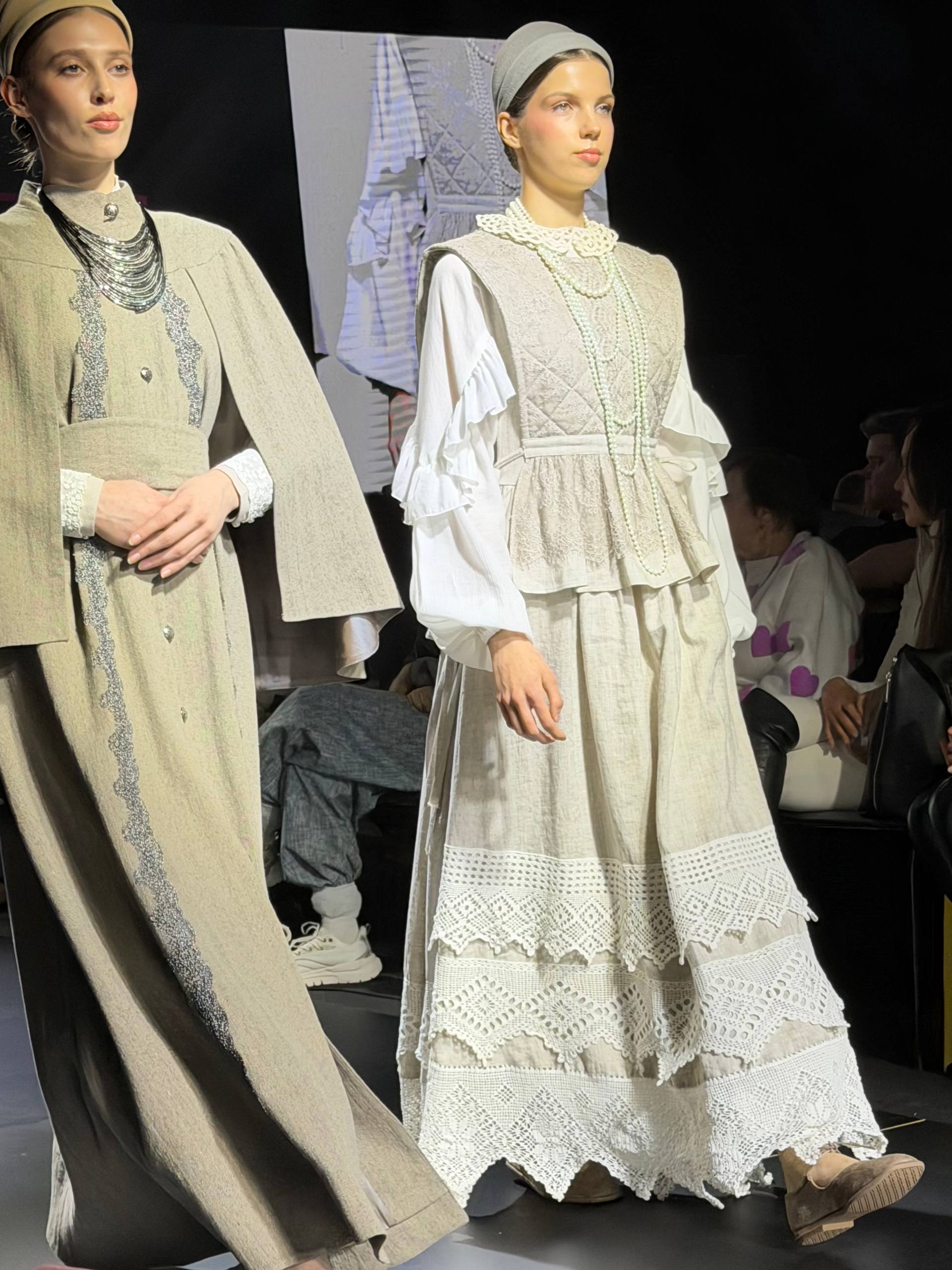 Венера Насонова, дизайнер бренда «Успенская Артель», презентовала коллекцию по народным мотивам. Это некий neo-фольклор, переигранный на минималистичный лад. Длинные платья с объемными рукавами и кружевными манжетами представлены в белых и синих оттенках. Ткань по текстуре отдаленно напоминает лен, и вместе с тем отлично передает легкость каждого образа. На моделях кокошники. Для мужчин представлен жакет с вышивкой на воротнике. Музыкальное сопровождение показа безотказно передало русский национальный колорит.
