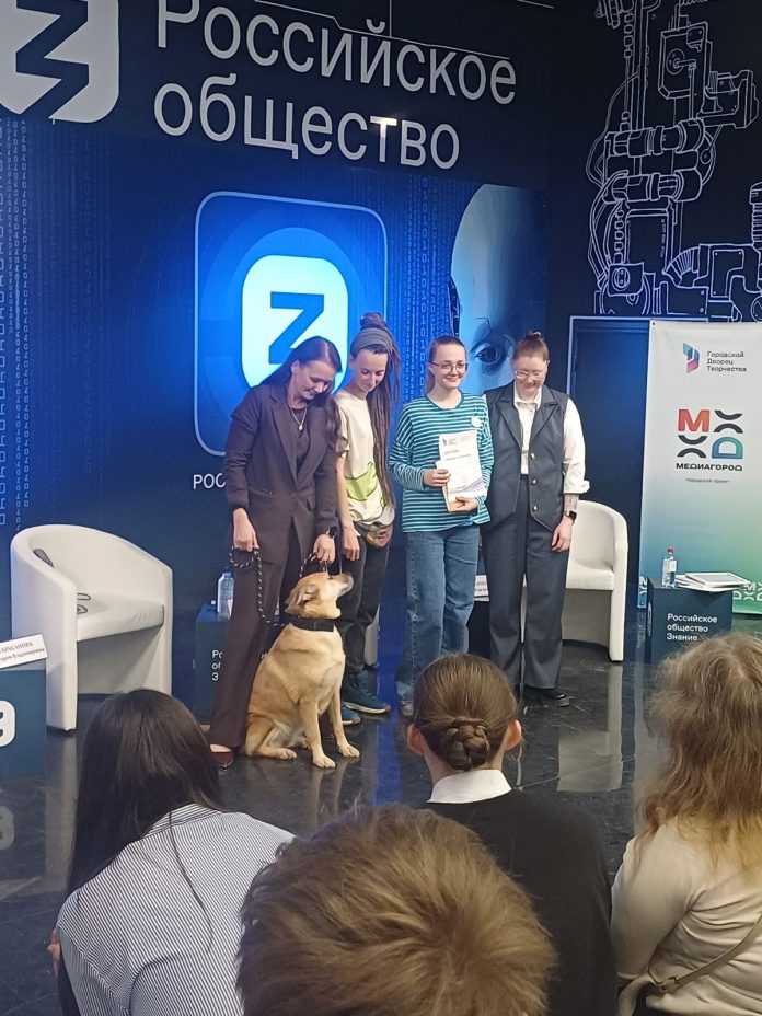 В продолжение конференции Барабанова Виктория, заместитель директора ветеринарной клиники «Здоровье животных», соучредитель организации в сфере помощи временно бездомным животным «Везунчик», познакомила юных журналистов с особым гостем — собакой Умой. Ума живет в приюте «Везунчик» с 2016 года. Ума — первая в России собака-канистерапевт из приюта. Она ездит по домам престарелых и по детским домам и участвует в реабилитационном процессе. «Когда мы приходим в дома престарелых, реакция у пожилых людей налицо. Они оживают, начинают двигать руками, которыми не двигали до этого. Они тянутся к этому» — признается Виктория. История Умы показывает, что собаки, оказавшиеся на улице, могут дарить любовь, тепло и исцеление.